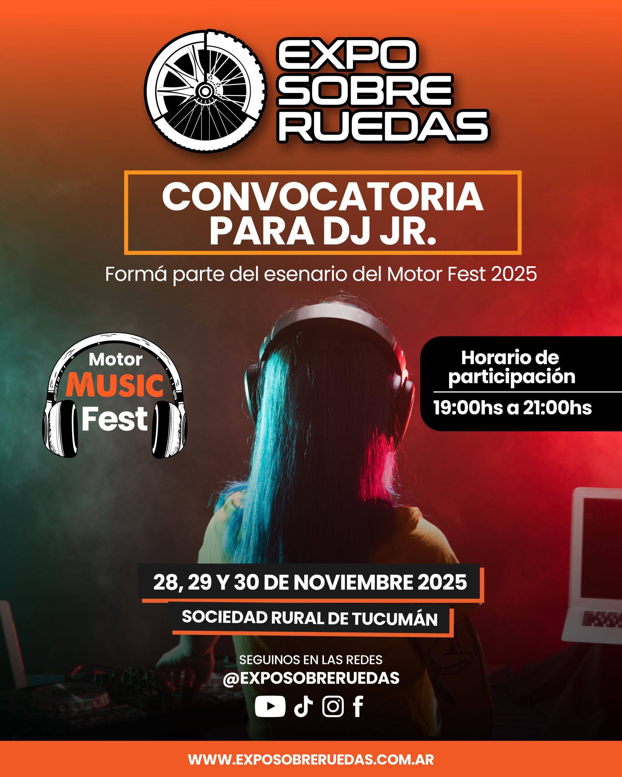 La Expo Sobre Ruedas 2025 abre su convocatoria para DJ Jr., invitando a jóvenes talentos a formar parte del escenario del Motor Music Fest. Del 28 al 30 de noviembre, en la Sociedad Rural de Tucumán, los seleccionados podrán mostrar su estilo y energía musical ante miles de asistentes.