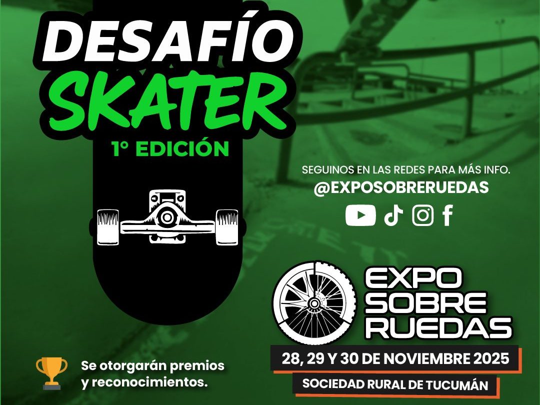 La primera edición del Desafío Skater llega a Expo Sobre Ruedas 2025. Tres días de competencia, trucos y adrenalina sobre tablas, del 28 al 30 de Noviembre en la Sociedad Rural de Tucumán.